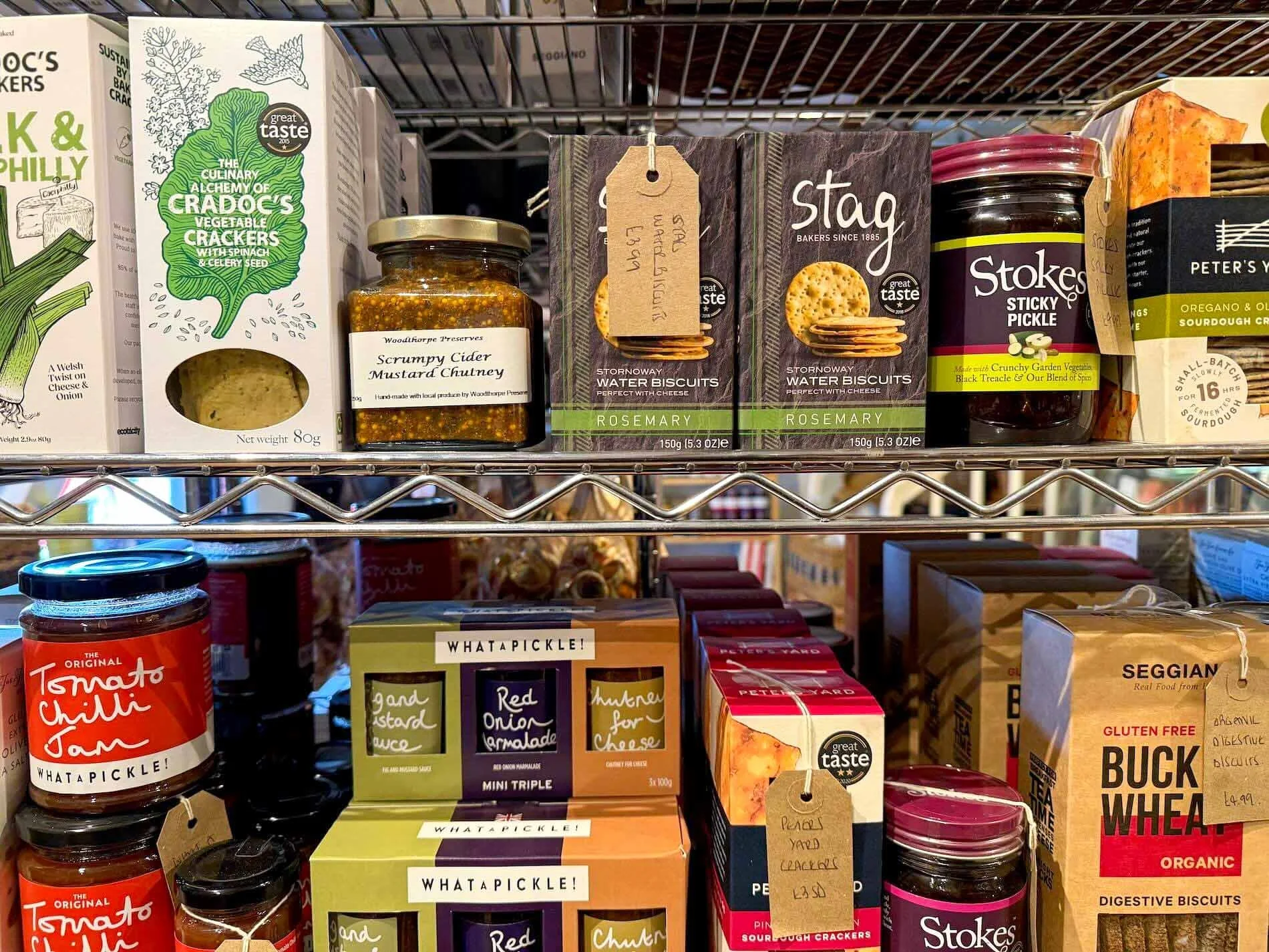 Everyday meals get elevated with sauces from Stokes — from ketchup to BBQ and burger relishes — or historic recipes like Geo Watkins Mushroom Ketchup and Anchovy Sauce. Pickles, chutneys, and crackers are all here: What a Pickle! Tomato Chilli Jam, Scrumpy Cider Mustard Chutney, Stag water biscuits, Seggiano buckwheat biscuits, and even playful Cheese Nibbles in chilli and chive varieties. Look closely and you’ll also discover indulgent touches like Italian Bussy wafers for decorating desserts.